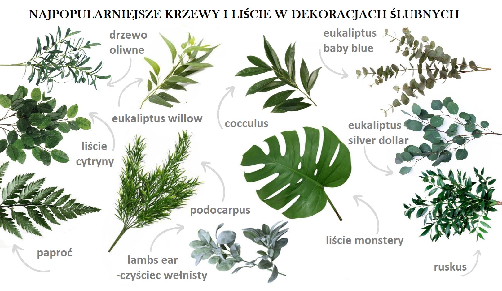- Po pierwsze – musisz wiedzieć, że kwiaty to dobro sezonowe. Wybrany przez Ciebie wykonawca jest w stanie wyczarować prawie wszystkie kwiaty o każdej porze roku – ale to kosztuje. I często słono. W dobie covidowej rzeczywistości (i po-covidowej) mocno zachwiane są łańcuchy dostaw. Opóźnienia, pomyłkowe zamówienia, braki dostaw – to globalny porządek dzienny w każdej dziedzinie gospodarki. I choć wszystko wraca już do normy, to chyba nie chcesz ryzykować, że cokolwiek w dniu ślubu się nie uda. Dodajmy do tego szalejące kursy walut, inflację w wielu krajach i upadki firm. Podwyżki gwarantowane, skubią nas na każdym kroku. Więc zanim przystąpisz do tworzenia w swojej głowie wizji „idealnego dnia” weź pod uwagę porę roku i sprawdź, jakie kwiaty są wtedy dostępne i w miarę lokalne. Tak uchronisz się przed ogromnym cenowym rozczarowaniem. Lub awaryjną zmianą motywu wesela. To powinno być Twoje pierwsze pytanie do osoby, z którą będziesz współpracować w tym zakresie. Jakie kwiaty w tym terminie to dobry pomysł? Pomyśl też o trendzie greenery. Tutaj dekoracją są zielone liście lub krzewy, które stanowią samodzielną dekorację lub zielony wypełniacz bukietów z kwiatów. Poniżej mała ściąga z rodzajów.